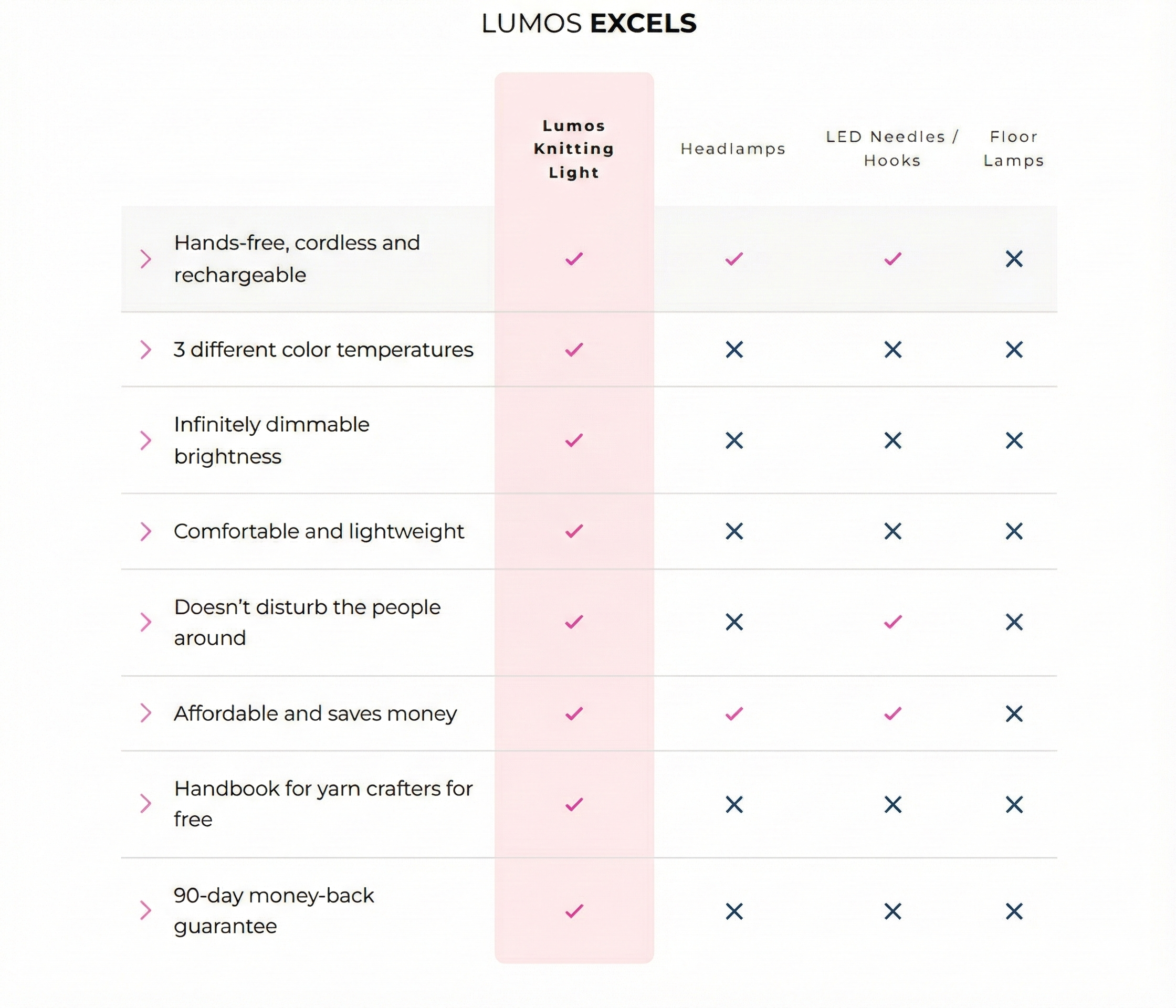 Before the Lumos Knitting Light, knitters relied on improvised lighting like headlamps or book lights none designed for crafting and often uncomfortable. Lumos changes that with gentle, focused light made specifically for crafters, supporting long sessions without strain. Once you try it, you’ll immediately feel the difference a small upgrade that transforms the entire knitting experience.